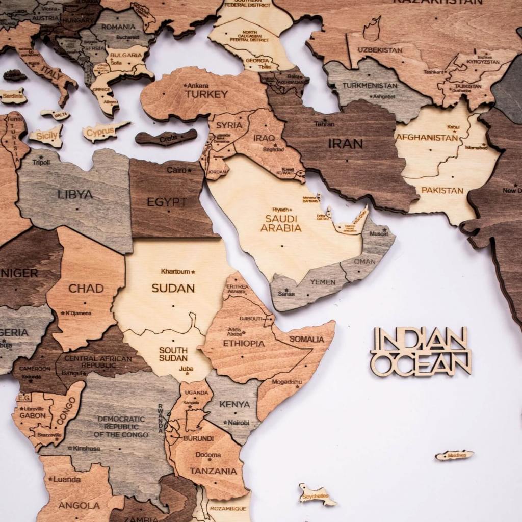 Дерев’яна карта світу — це не просто прикраса, а елемент, який формує настрій кімнати. Вона допомагає візуально структурувати простір, робить його більш завершеним та гармонійним. Крім того, такий декор часто стає тематичним центром уваги, навколо якого вибудовується весь інтер’єр.